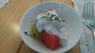 Melonen mit Kugelausstecher ausstechen und einige Stunden in etwas Limettensaft, Pfeffer, Salz, Maraschino o.ä. im Kühlschrank durchziehen lassen, Burrata darauf anrichten, mit Sprossen